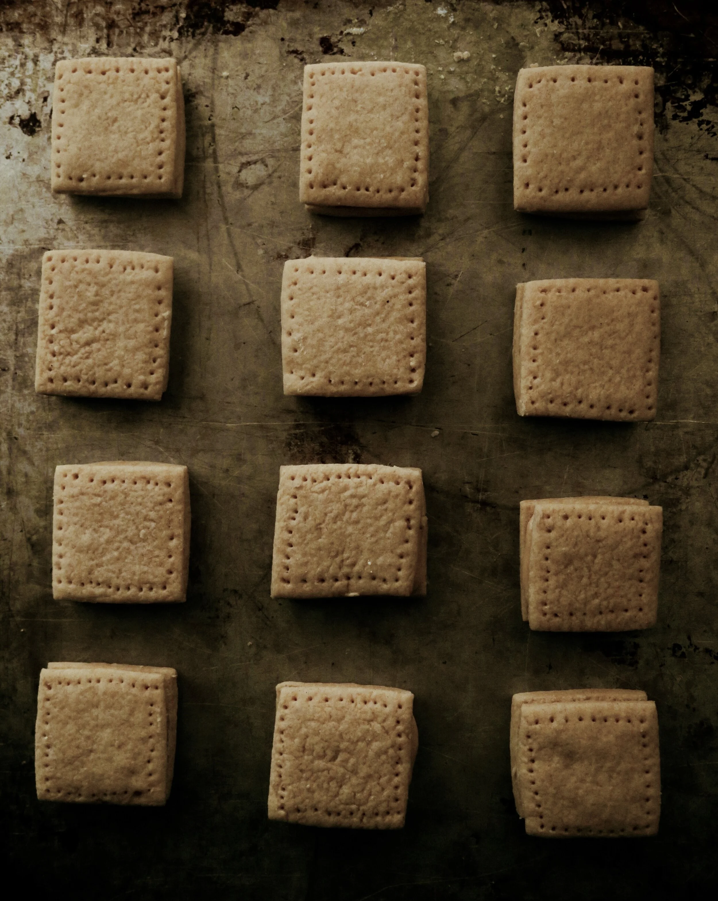5) On a surface lightly dusted with flour, roll the dough out to a rectangle roughly 35cm x 20cm (about 3mm thick). Using a long knife, slice the rolled-out dough into 28 squares, 5cm x 5cm. You can do this by cutting the dough in half lengthways. Then again dividing the strip in half (so you end up with four long strips). Once the dough has been cut into squares, gently lift them on to the tray and space them about 2cm apart (they won't spread much, if at all). If you wish, use the toothpick to make dots around the border of the biscuits to imitate stitching. Place in the oven to bake for 4-6 minutes or until the biscuits are cooked through. They do not need to be golden, and it is better to err on the side of caution and slightly under-bake them as they will continue to cook on the baking tray once removed from the oven.